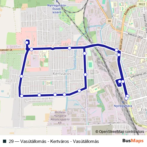 The first stop of the 29 bus route is Nyíregyháza, vasútállomás and the last stop is Nyíregyháza, vasútállomás. 29 (Vasútállomás - Kertváros - Vasútállomás) is operational during everyday.