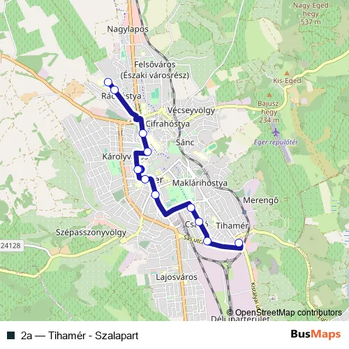 The first stop of the 2a bus route is Eger, Szalapart út and the last stop is Eger, Tihaméri malom. 2a (Tihamér - Szalapart) is operational during everyday.
