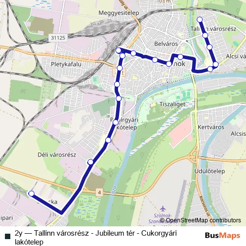 The first stop of the 2y bus route is Szolnok, Unisil Kft. and the last stop is Szolnok, Tallinn városrész. 2y (Tallinn városrész - Jubileum tér - Cukorgyári lakótelep) is operational during everyday.