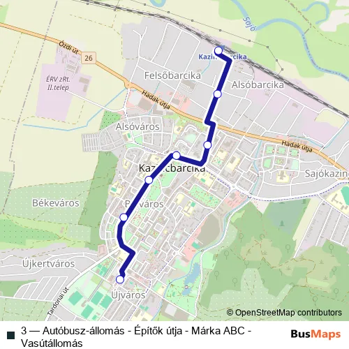 The first stop of the 3 bus route is Kazincbarcika, vasútállomás and the last stop is Kazincbarcika, autóbusz-állomás. 3 (Autóbusz-állomás - Építők útja - Márka ABC - Vasútállomás) is operational during on weekdays.