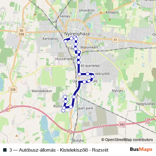 The first stop of the 3 bus route is Nyíregyháza, autóbusz-állomás and the last stop is Nyíregyháza, Rozsrét autóbusz-forduló. 3 (Autóbusz-állomás - Kistelekiszőlő - Rozsrét) is operational during everyday.