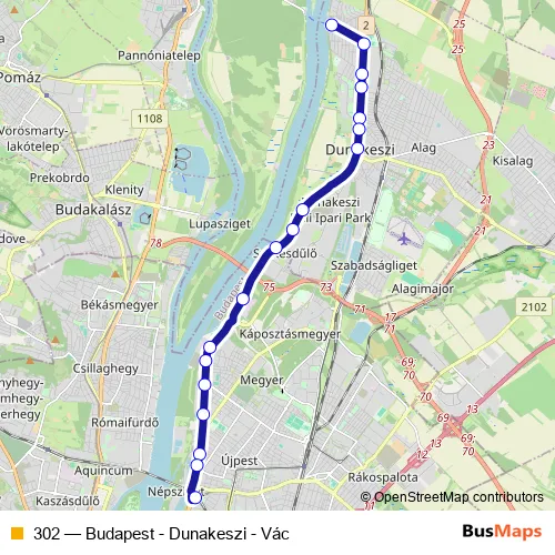 The first stop of the 302 bus route is Dunakeszi, Horányi rév and the last stop is Budapest, Újpest-Városkapu Xiii. kerület. 302 (Budapest - Dunakeszi - Vác) is operational during on weekdays.