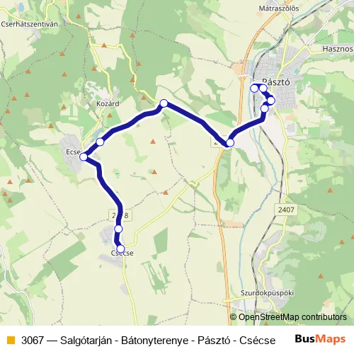 The first stop of the 3067 bus route is Csécse, autóbusz-váróterem and the last stop is Salgótarján, autóbusz-állomás. 3067 (Salgótarján - Bátonyterenye - Pásztó - Csécse) is operational during on weekdays.