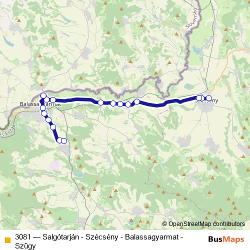 The first stop of the 3081 bus route is Szécsény, autóbusz-állomás and the last stop is Szügy, Magna Kft.. 3081 (Salgótarján - Szécsény - Balassagyarmat - Szügy) is operational during everyday.