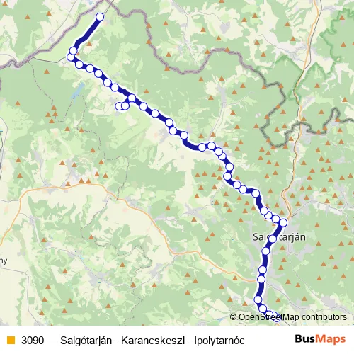 The first stop of the 3090 bus route is Salgótarján, Ipari Park, forduló and the last stop is Ipolytarnóc, autóbusz-forduló. 3090 (Salgótarján - Karancskeszi - Ipolytarnóc) is operational during everyday.