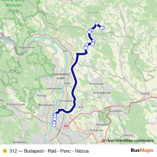 The first stop of the 312 bus route is Nézsa, gyógyszertár and the last stop is Budapest, Újpest-Városkapu Xiii. kerület. 312 (Budapest - Rád - Penc - Nézsa) is operational during on weekdays.