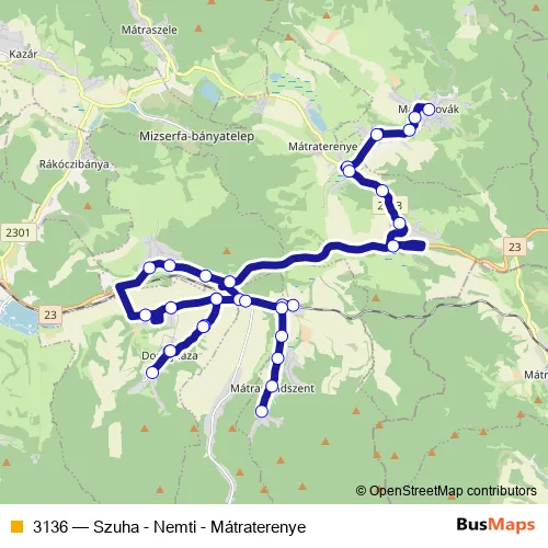 The first stop of the 3136 bus route is Mátranovák, Faluközpont and the last stop is Mátramindszent, Béke út. 3136 (Szuha - Nemti - Mátraterenye) is operational during on weekdays.