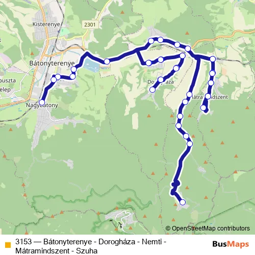 The first stop of the 3153 bus route is Szuha (Mátraalmás), Fő tér and the last stop is Bátonyterenye-Nagybátony, Ózdi út 10.. 3153 (Bátonyterenye - Dorogháza - Nemti - Mátramindszent - Szuha) is operational during on weekdays.