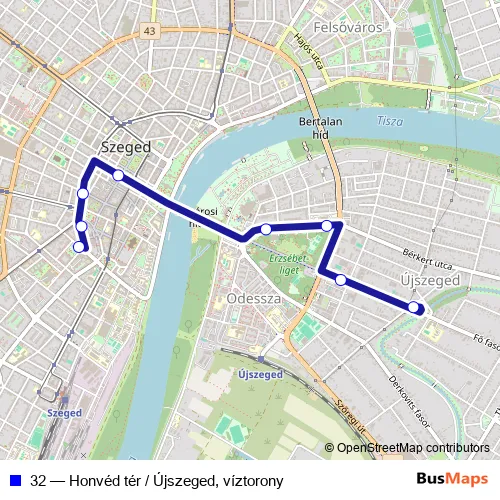 The first stop of the 32 bus route is Honvéd tér and the last stop is Újszeged, víztorony. 32 (Honvéd tér / Újszeged, víztorony) is operational during on weekdays.