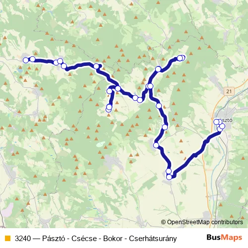 Services on the 3240 - Pásztó - Csécse - Bokor - Cserhátsurány bus stop at 21:05 on Monday, Tuesday, Wednesday, Thursday, Friday, Saturday, Sunday.