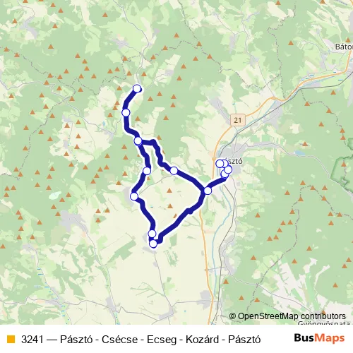 The first stop of the 3241 bus route is Pásztó, vasútállomás and the last stop is Pásztó, vasútállomás. 3241 (Pásztó - Csécse - Ecseg - Kozárd - Pásztó) is operational during on weekdays.