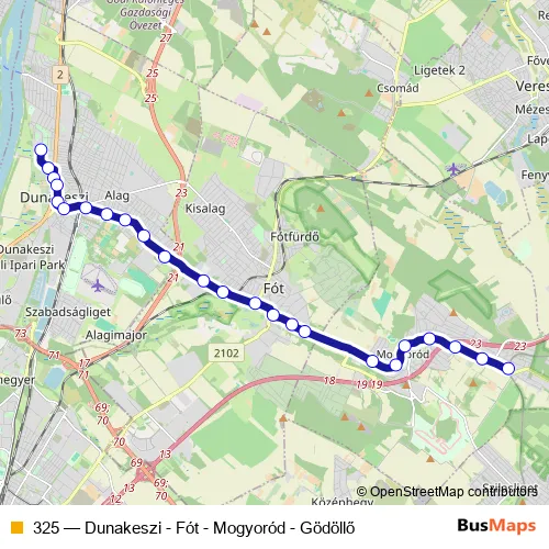 The first stop of the 325 bus route is Dunakeszi, Barátság útja 39. and the last stop is Mogyoród, HÉV-állomás. 325 (Dunakeszi - Fót - Mogyoród - Gödöllő) is operational during on weekdays.