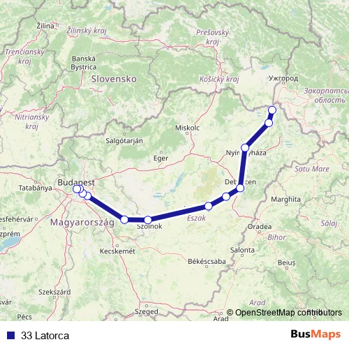 The first stop of the 33 Latorca rail route is Tuzsér and the last stop is Budapest-Nyugati. 33 Latorca is operational during on weekdays.