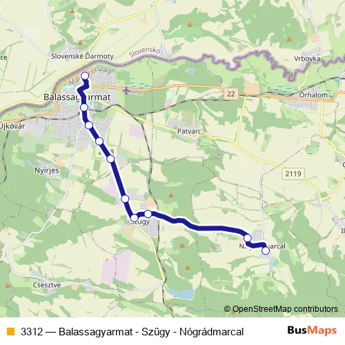 The first stop of the 3312 bus route is Nógrádmarcal, községháza and the last stop is Balassagyarmat, autóbusz-állomás. 3312 (Balassagyarmat - Szügy - Nógrádmarcal) is operational during on weekdays.