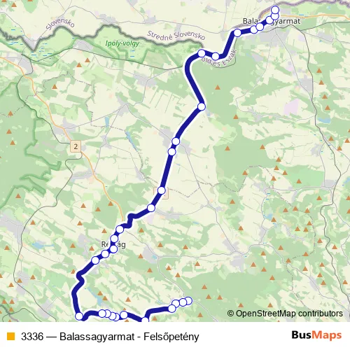 The first stop of the 3336 bus route is Felsőpetény, Alsópetényi elágazás and the last stop is Balassagyarmat, autóbusz-állomás. 3336 (Balassagyarmat - Felsőpetény) is operational during on weekdays.