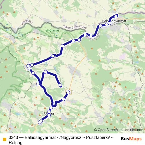 The first stop of the 3343 bus route is Balassagyarmat, autóbusz-állomás and the last stop is Rétság, HI-LEX Kft.. 3343 (Balassagyarmat - /Nagyoroszi - Pusztaberki/ - Rétság) is operational during everyday.