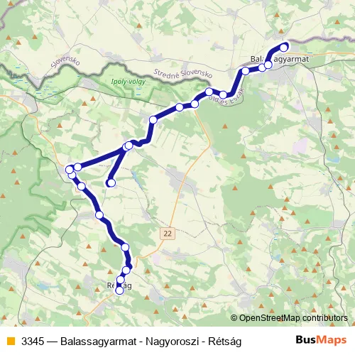 The first stop of the 3345 bus route is Rétság, autóbusz-forduló and the last stop is Balassagyarmat, autóbusz-állomás. 3345 (Balassagyarmat - Nagyoroszi - Rétság) is operational during everyday.