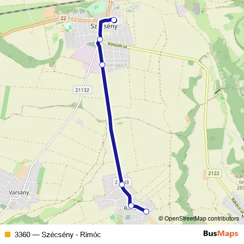 The first stop of the 3360 bus route is Rimóc, autóbusz-forduló and the last stop is Szécsény, autóbusz-állomás. 3360 (Szécsény - Rimóc) is operational during everyday.
