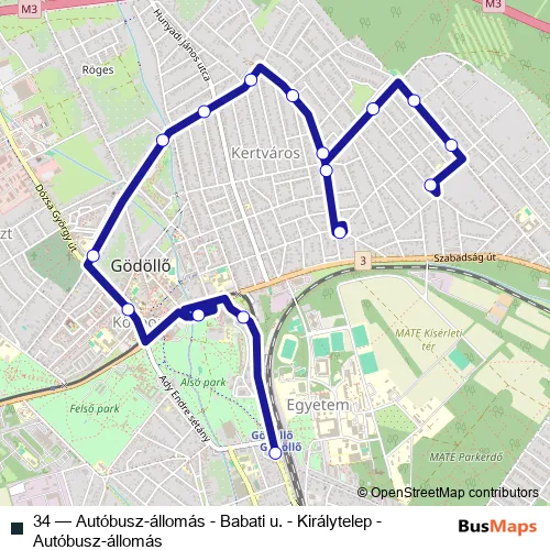The first stop of the 34 bus route is Gödöllő, Királytelep autóbusz-forduló and the last stop is Gödöllő, vasútállomás. 34 (Autóbusz-állomás - Babati u. - Királytelep - Autóbusz-állomás) is operational during on weekdays.