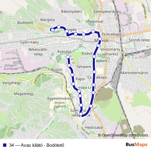 The first stop of the 34 bus route is Avas kilátó and the last stop is Bodótető. 34 (Avas kilátó - Bodótető) is operational during everyday.