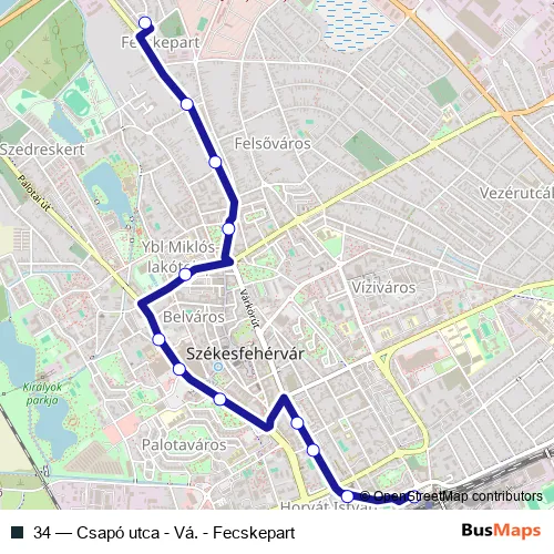 The first stop of the 34 bus route is Székesfehérvár, Fecskeparti lakótelep and the last stop is Székesfehérvár, vasútállomás. 34 (Csapó utca - Vá. - Fecskepart) is operational during everyday.