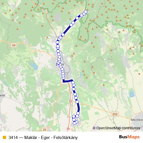 The first stop of the 3414 bus route is Maklár, Templom tér and the last stop is Felsőtárkány, Csárda. 3414 (Maklár - Eger - Felsőtárkány) is operational during on weekdays.