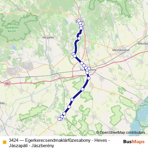 The first stop of the 3424 bus route is Eger, autóbusz-állomás and the last stop is Heves, autóbusz-állomás. 3424 (Egerkerecsendmaklárfüzesabony - Heves - Jászapáti - Jászberény) is operational during everyday.