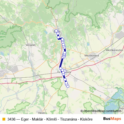 The first stop of the 3436 bus route is Besenyőtelek, Temető and the last stop is Eger, autóbusz-állomás. 3436 (Eger - Maklár - Kömlő - Tiszanána - Kisköre) is operational during on weekdays.