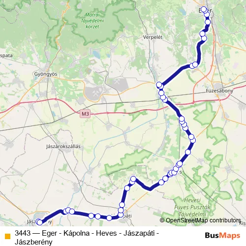 The first stop of the 3443 bus route is Jászberény, autóbusz-állomás and the last stop is Eger, autóbusz-állomás. 3443 (Eger - Kápolna - Heves - Jászapáti - Jászberény) is operational during everyday.
