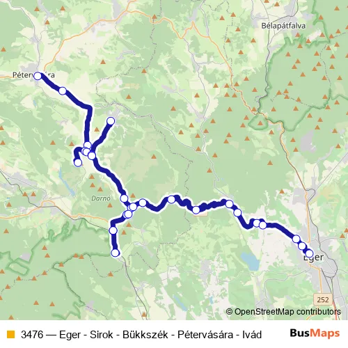 The first stop of the 3476 bus route is Pétervására, városháza and the last stop is Eger, autóbusz-állomás. 3476 (Eger - Sirok - Bükkszék - Pétervására - Ivád) is operational during everyday.