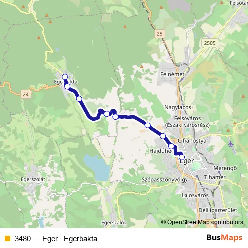 The first stop of the 3480 bus route is Egerbakta, Újtelep and the last stop is Eger, autóbusz-állomás. 3480 (Eger - Egerbakta) is operational during on weekdays.