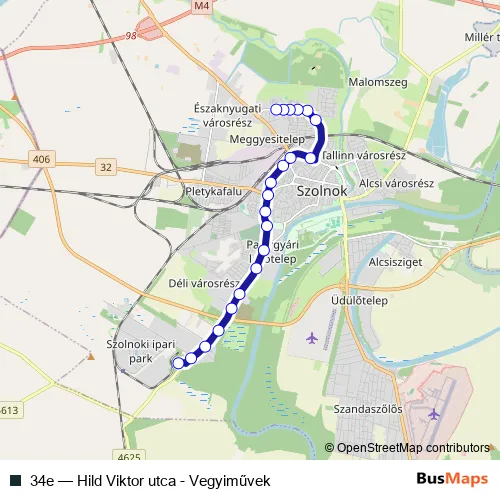 The first stop of the 34e bus route is Szolnok, Vegyiművek and the last stop is Szolnok, Hild Viktor utca. 34e (Hild Viktor utca - Vegyiművek) is operational during on weekdays.