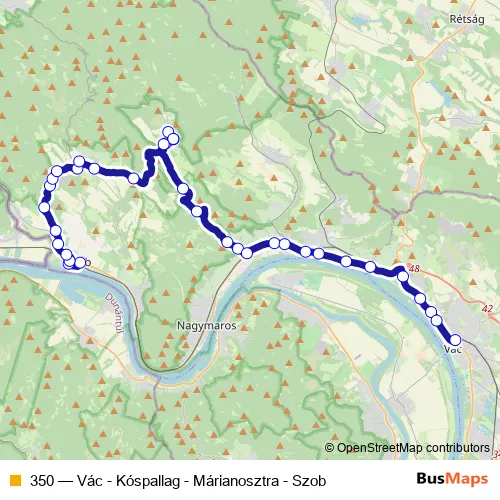 The first stop of the 350 bus route is Szob, Szakorvosi Rendelőintézet and the last stop is Vác, autóbusz-állomás. 350 (Vác - Kóspallag - Márianosztra - Szob) is operational during everyday.