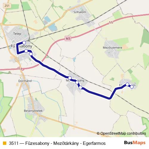 The first stop of the 3511 bus route is Egerfarmos, Rákóczi út 82. and the last stop is Füzesabony, vasútállomás. 3511 (Füzesabony - Mezőtárkány - Egerfarmos) is operational during everyday.