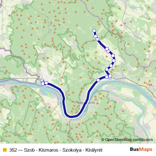 The first stop of the 352 bus route is Szob, vasútállomás and the last stop is Szokolya, Királyrét vasúti megállóhely. 352 (Szob - Kismaros - Szokolya - Királyrét) is operational during everyday.