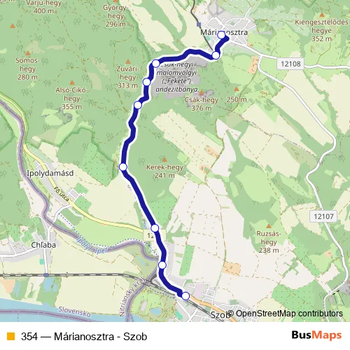 The first stop of the 354 bus route is Márianosztra, autóbusz-forduló and the last stop is Szob, vasútállomás. 354 (Márianosztra - Szob) is operational during everyday.