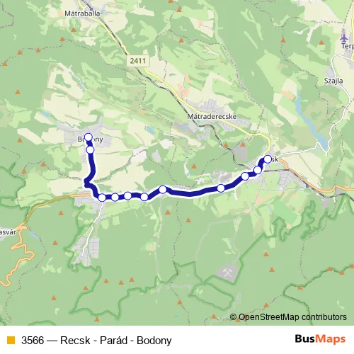 The first stop of the 3566 bus route is Bodony, Italbolt and the last stop is Recsk, mátraderecskei elágazás. 3566 (Recsk - Parád - Bodony) is operational during on weekdays.