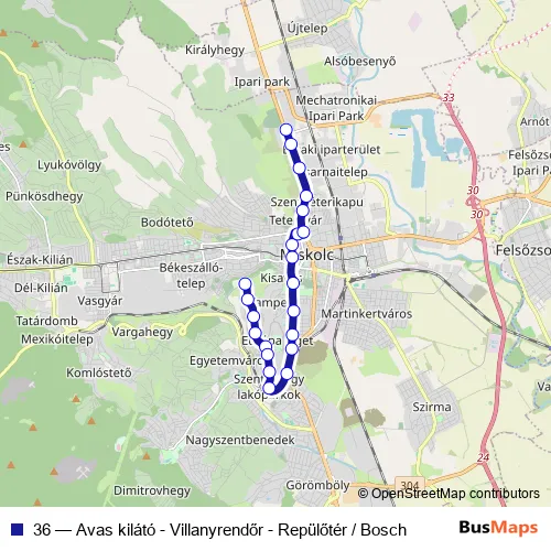 The first stop of the 36 bus route is Avas kilátó and the last stop is Repülőtér / Bosch. 36 (Avas kilátó - Villanyrendőr - Repülőtér / Bosch) is operational during everyday.