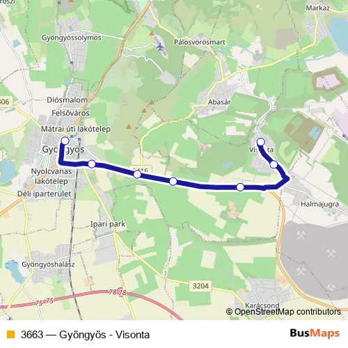 The first stop of the 3663 bus route is Visonta, Hősök tere and the last stop is Gyöngyös, autóbusz-állomás. 3663 (Gyöngyös - Visonta) is operational during everyday.