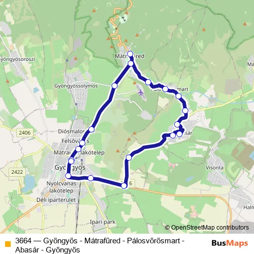 The first stop of the 3664 bus route is Gyöngyös, autóbusz-állomás and the last stop is Gyöngyös, autóbusz-állomás. 3664 (Gyöngyös - Mátrafüred - Pálosvörösmart - Abasár - Gyöngyös) is operational during everyday.