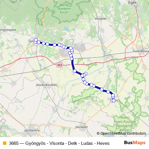 The first stop of the 3665 bus route is Heves, autóbusz-állomás and the last stop is Gyöngyös, autóbusz-állomás. 3665 (Gyöngyös - Visonta - Detk - Ludas - Heves) is operational during everyday.