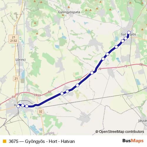 The first stop of the 3675 bus route is Gyöngyös, autóbusz-állomás and the last stop is Hatvan, autóbusz-pályaudvar. 3675 (Gyöngyös - Hort - Hatvan) is operational during everyday.