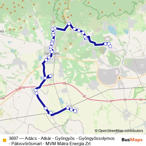 Click here to view the nearest 3697 - Adács - Atkár - Gyöngyös - Gyöngyössolymos - Pálosvörösmart - MVM Mátra Energia Zrt bus stop.