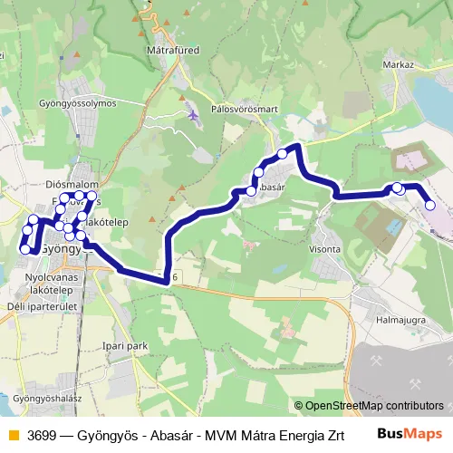 The first stop of the 3699 bus route is Gyöngyös, autóbusz-állomás and the last stop is MVM Mátra Energia Zrt.. 3699 (Gyöngyös - Abasár - MVM Mátra Energia Zrt) is operational during on weekends.