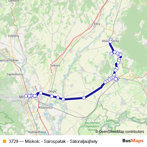 The first stop of the 3729 bus route is Abaújszántó, piactér and the last stop is Miskolc, autóbusz-állomás. 3729 (Miskolc - Sárospatak - Sátoraljaújhely) is operational during on weekdays.