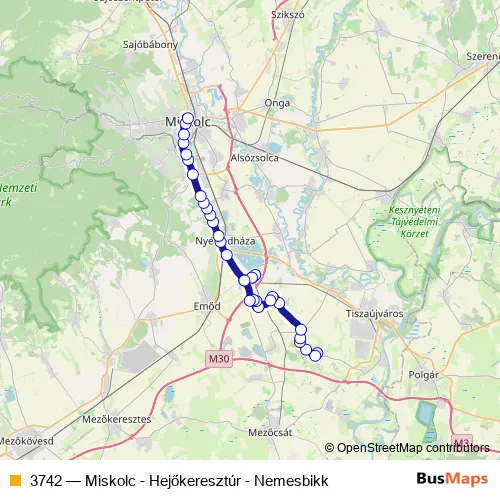 The first stop of the 3742 bus route is Nemesbikk, autóbusz-forduló and the last stop is Miskolc, autóbusz-állomás. 3742 (Miskolc - Hejőkeresztúr - Nemesbikk) is operational during everyday.