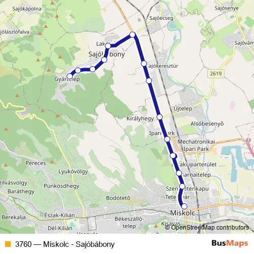 The first stop of the 3760 bus route is Miskolc, autóbusz-állomás and the last stop is Sajóbábony, Ipari park. 3760 (Miskolc - Sajóbábony) is operational during everyday.