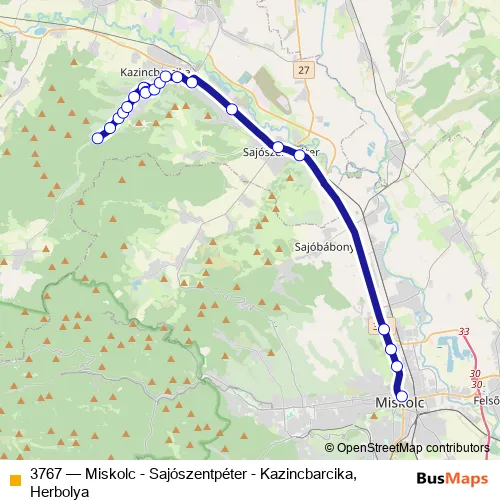 The first stop of the 3767 bus route is Kazincbarcika, Herbolya Tervtáró and the last stop is Miskolc, autóbusz-állomás. 3767 (Miskolc - Sajószentpéter - Kazincbarcika, Herbolya) is operational during everyday.