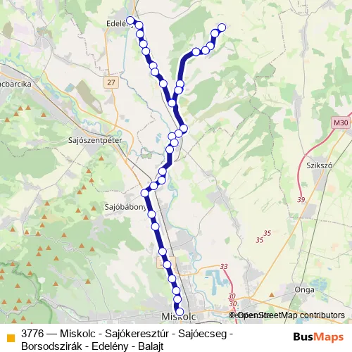 The first stop of the 3776 bus route is Edelény, autóbusz-állomás and the last stop is Miskolc, autóbusz-állomás. 3776 (Miskolc - Sajókeresztúr - Sajóecseg - Borsodszirák - Edelény - Balajt) is operational during everyday.