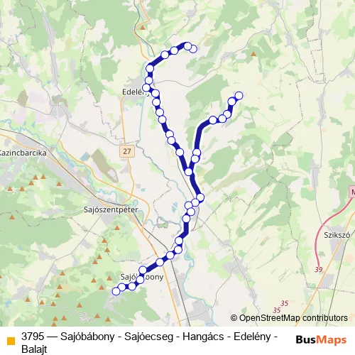 The first stop of the 3795 bus route is Balajt, autóbusz-váróterem and the last stop is Sajóbábony, Ipari park. 3795 (Sajóbábony - Sajóecseg - Hangács - Edelény - Balajt) is operational during everyday.